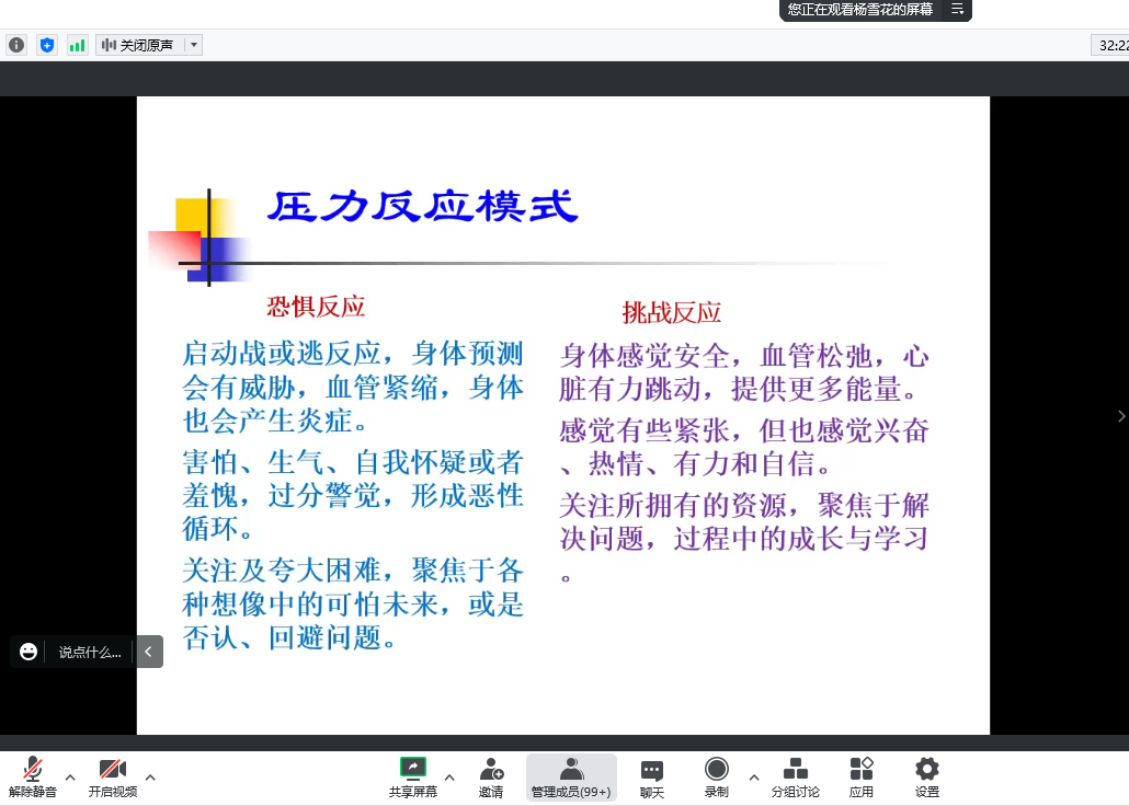 临近期末,大家陆续开始考试,秋冬季又是个心理波动较大的季节,压力增大;加上大四同学即将参加研究生升学考试,各式压力呈现在我们面前。为了帮助同学们更好地认识压力、学会积极地应对压力,杨老师从心理学的角度对压力和压力管理进行了专业又浅显的讲析。从压力的来源到压力的定义,杨老师认为对压力的认知影响了压力对我们的作用:认为压力有害的个体,压力将造成破坏性的影响;认为压力有益的个体,压力则促进我们身心健康。因此,改变我们的认知,直面压力,增强我们的人际连结、增强我们与自然的联结,将会让我们变压力为动力,成长得才会更为强大!