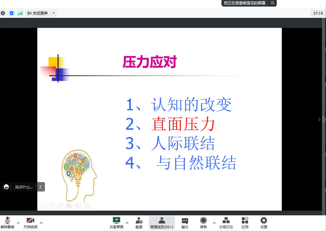 讲座过后,同学们积极提问,不仅将生活中遇到的压力与杨老师进行分享,也提出了关于压力的生理学基础的疑问,杨老师一一解答。虽然是线上讲座,但杨老师深入浅出、结合实际的讲解,让同学们沉浸式地感受到了心理学的魅力。同学们不仅关爱了自身健康,也拓宽了自己的知识面,会后纷纷表示希望有更多的讲座让大家参与其中。让我们一起为营造和谐、努力的学习氛围而努力,更好地面对挑战和未来!