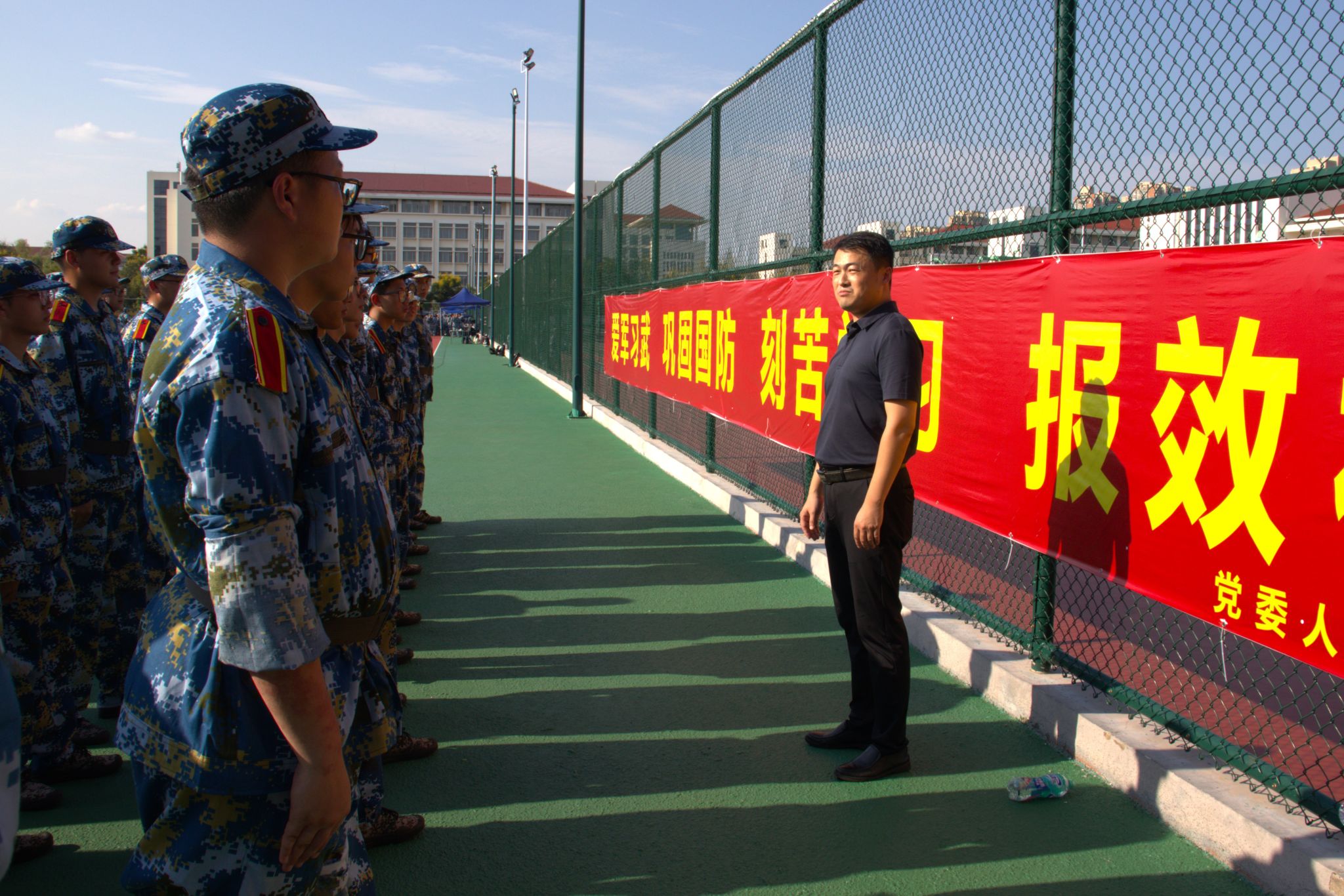 军训场上,新生们身着整齐的迷彩服,口号嘹亮、精神抖擞,动作整齐划一、步伐铿锵有力。党委书记叶原丰对新生的精神面貌和纪律性表示赞赏。他表示,在短暂的军训生活中,同学们战骄阳、斗酷热、经风雨、磨意志,必将以昂扬的激情迈开大学生活的第一步。院长郝凌云对中暑的同学表示了关切,提醒同学们及时补充水分,必要时就医。她还参与到训练队伍中来,同新生一起站军姿,以身作则,鼓励同学们体会军人作风、军人甘苦和军人品格。党委副书记陈智慧指出,新生军训是大学文化最重要的内容之一,希望同学们能以积极的态度和热情投入训练,厚植爱国情怀,锤炼坚强意志。
